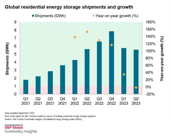 根據(jù)S&P Global Commodity Insights數(shù)據(jù),2023年Q2,全球戶用儲能出貨量較Q1下降了2%,這是戶儲有統(tǒng)計(jì)數(shù)據(jù)以來的第一次。