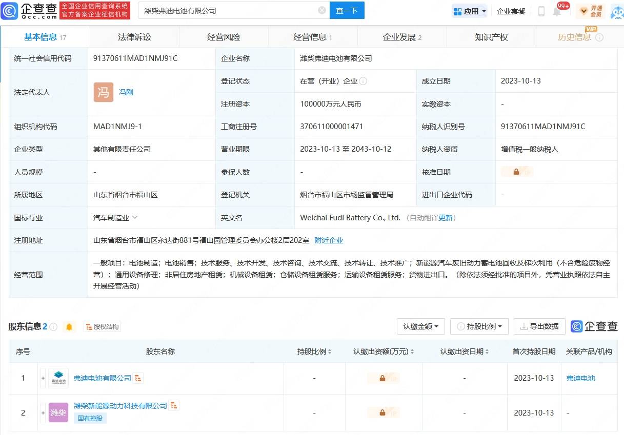 近日,濰柴弗迪電池有限公司成立,法定代表人為馮剛,注冊資本10億,經(jīng)營范圍含電池制造,電池銷售,技術(shù)服務(wù)、技術(shù)開發(fā)、技術(shù)咨詢、技術(shù)交流、技術(shù)轉(zhuǎn)讓、技術(shù)推廣,新能源汽車廢舊動力蓄電池回收及梯次利用等。