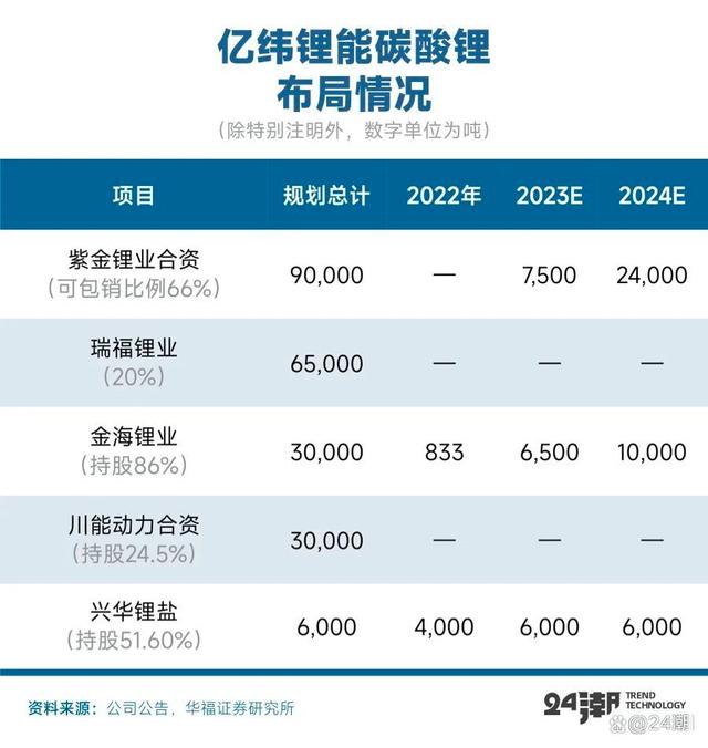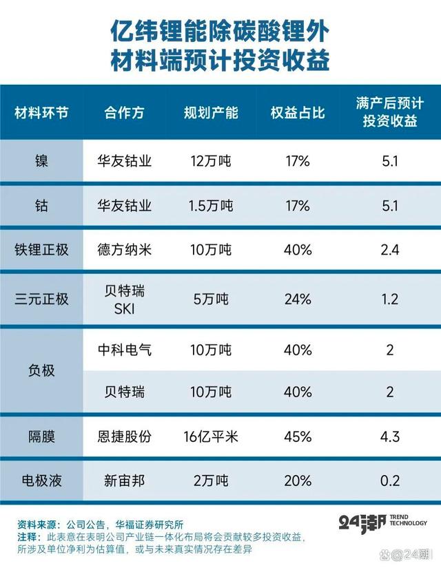 據(jù)華福證券預測,2022年億緯鋰能碳酸鋰可自供量約為2779噸,自供比列約為14%,未來還將逐年快速提升,至2024年其碳酸鋰自供比例將升至33%,根據(jù)其長遠產(chǎn)能規(guī)劃,未來很可能達到49%;而億緯鋰能在上游鈷鎳、正負極材料、隔膜以及電解液等材料領域的產(chǎn)業(yè)布局一旦滿產(chǎn)后,預計合計將實現(xiàn)22.3億元的投資收益。