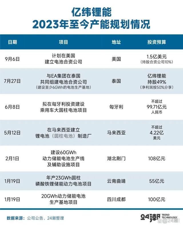 另據(jù)24潮團隊統(tǒng)計,在5月、6月和7月億緯鋰能三次發(fā)布擴張公告,其計劃投入上百億資金在馬來西亞、匈牙利和泰國獨資或合資建設電池基地項目,詳見下表