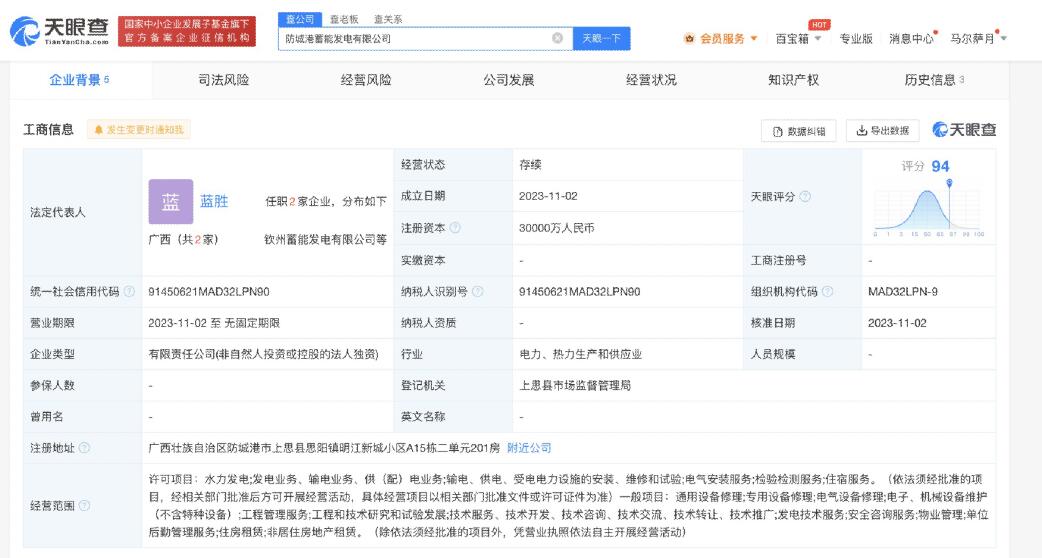 南方財經(jīng)11月7日電,天眼查App顯示,近日,防城港蓄能發(fā)電有限公司成立,法定代表人為藍(lán)勝,注冊資本3億人民幣,經(jīng)營范圍含水力發(fā)電、電氣安裝服務(wù)、通用設(shè)備修理、電氣設(shè)備修理、工程管理服務(wù)、發(fā)電技術(shù)服務(wù)、單位后勤管理服務(wù)、非居住房地產(chǎn)租賃等。股東信息顯示,該公司由南網(wǎng)儲能全資持股。