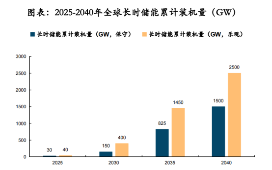 由中國(guó)能源研究會(huì)發(fā)布的《構(gòu)建新型電力系統(tǒng)路徑研究》報(bào)告顯示,2020—2030年,新能源在國(guó)家能源結(jié)構(gòu)中的占比將逐步提高,預(yù)計(jì)風(fēng)光發(fā)電占比將從2020年的9.3%提高到2030年的22.5%。根據(jù)麥肯錫數(shù)據(jù),長(zhǎng)時(shí)儲(chǔ)能于2025年起開始大規(guī)模增長(zhǎng)。2030年起全球可再生能源滲透率將升至約60%—70%,長(zhǎng)時(shí)儲(chǔ)能累計(jì)裝機(jī)量將達(dá)到150-400GW(對(duì)應(yīng)儲(chǔ)能容量5-10TWh),累計(jì)投資規(guī)模將達(dá)到2000億-5000億美元。到2040年,長(zhǎng)時(shí)儲(chǔ)能累計(jì)裝機(jī)量將加速達(dá)到1.5-2.5TW(對(duì)應(yīng)儲(chǔ)能容量85-140TWh),是目前全球儲(chǔ)能系統(tǒng)裝機(jī)量的8-15倍,累計(jì)投資額將達(dá)到1.5萬億-3萬億美元。