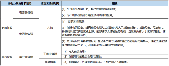 目前,儲(chǔ)能技術(shù)主要應(yīng)用于電力系統(tǒng)。具體而言,可以將儲(chǔ)能技術(shù)在電力系統(tǒng)中的典型應(yīng)用場(chǎng)景劃分為電源側(cè)、電網(wǎng)側(cè)和用戶側(cè)三個(gè)方面。其中電源側(cè)、電網(wǎng)側(cè)儲(chǔ)能又稱為表前儲(chǔ)能或大儲(chǔ),用戶側(cè)儲(chǔ)能又稱為表后儲(chǔ)能。用戶側(cè)儲(chǔ)能分為工商業(yè)儲(chǔ)能與戶儲(chǔ),兩者區(qū)別在于客戶群體。