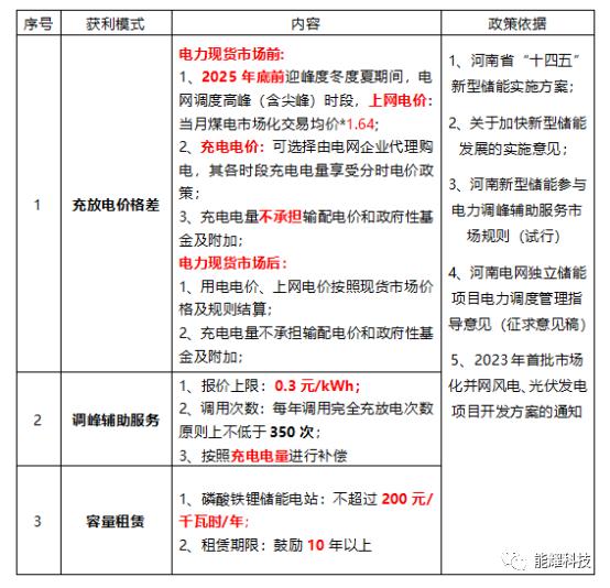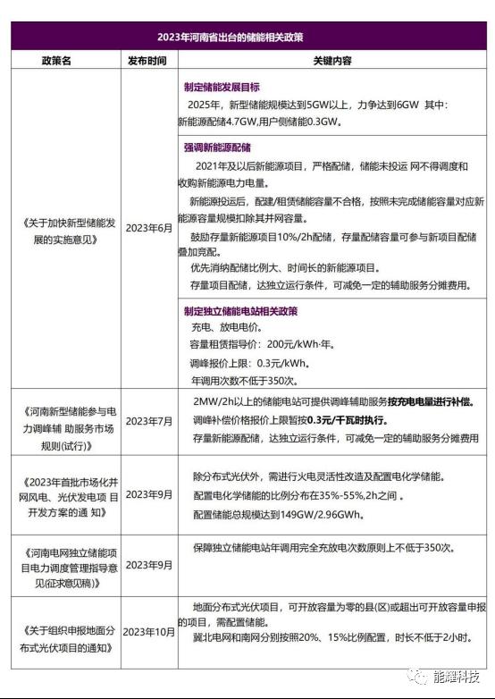 為推動河南儲能項目的開展,2023年,河南省密集出臺多項政策推動儲能發(fā)展,涉及電力調峰輔助服務、新能源配儲、獨立儲能容量租賃及調用次數等多方面。