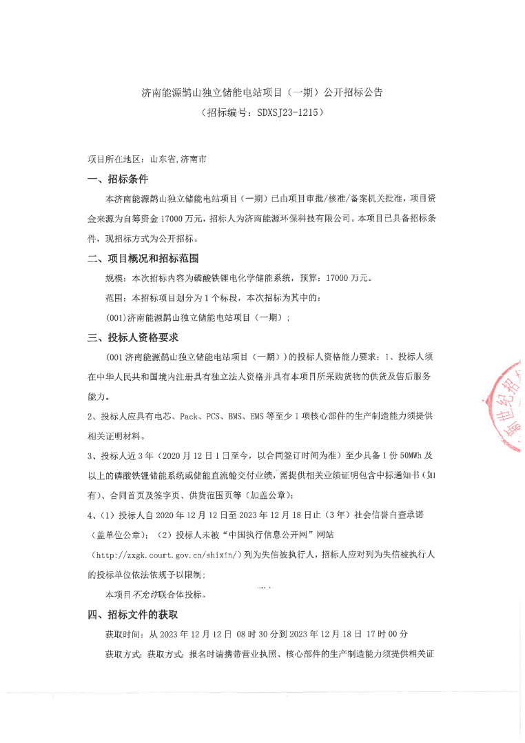 12月11日,濟(jì)南能源鵲山獨(dú)立儲(chǔ)能電站項(xiàng)目(一期)公開(kāi)招標(biāo)。項(xiàng)目預(yù)算為1.7億元,招標(biāo)內(nèi)容為磷酸鐵鋰電化學(xué)儲(chǔ)能系統(tǒng)。