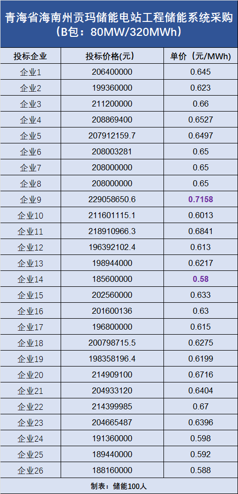 B包:容量為80MW/320MWh,共吸引了26家企業(yè)投標(biāo),最低報(bào)價(jià)為0.58元/Wh,最高報(bào)價(jià)為0.7158元/Wh。(投標(biāo)報(bào)價(jià)詳情見(jiàn)下圖)