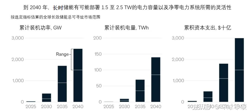 2021年,全球知名咨詢公司麥肯錫和長期儲能協(xié)會(LDES)發(fā)布的一份報(bào)告表示,到2040年,LDES 有可能在全球部署 1.5 至 2.5 TW)(太瓦)的裝機(jī)容量,是當(dāng)前部署的總儲能容量的8到15倍。對應(yīng)的儲能容量是 85-140TWh)(太瓦時(shí) )。