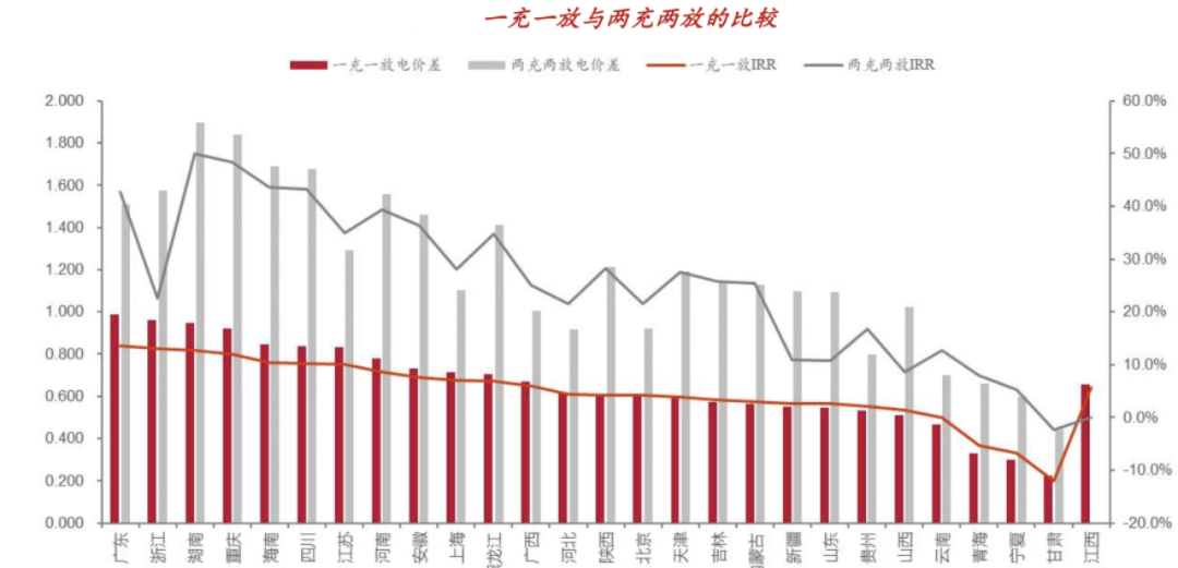 經(jīng)濟(jì)性分析:我們以容量1MWh、循環(huán)次數(shù)為6000次的儲能系統(tǒng),浙江的峰谷電價為例,假設(shè)年運(yùn)行天數(shù)為300天,單位投資為1.58元/Wh,充放電深度為90%,充、放電效率均為92%,考慮業(yè)主完全自建模式,不考慮資金成本,2充2放下(實(shí)際充放電次數(shù)假設(shè)為1.5),計算得IRR為22%,投資回收期為4.5年,儲能LCOS為0.49元/kWh。1充1放下,計算得IRR為8.86%,投資回收期為13年,儲能LCOS為0.72元/kWh。