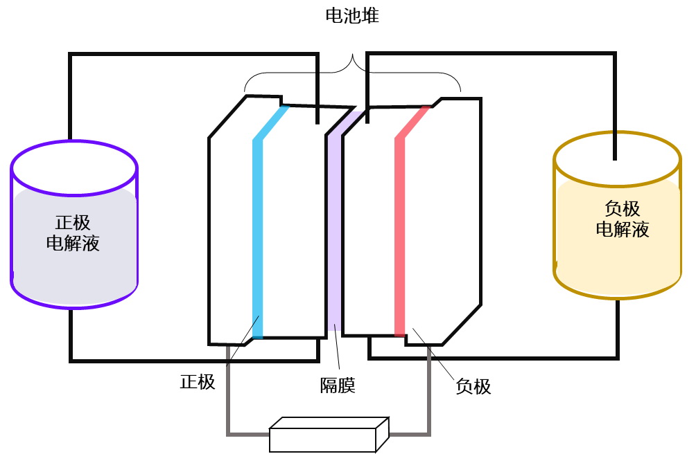 其次,從運(yùn)行原理上來(lái)看,液流電池的電解液,儲(chǔ)存在電池堆外的罐中。充放電時(shí),正負(fù)極電解質(zhì)會(huì)分別從循環(huán)泵進(jìn)入電池堆,發(fā)生氧化反應(yīng),反應(yīng)完成后,電解液會(huì)被重新泵回罐體中,照此循環(huán)往復(fù),直到反應(yīng)完全。由于電化學(xué)反應(yīng)和整個(gè)充放電過(guò)程,都是在水性的條件下發(fā)生,沒(méi)有燃燒爆炸的風(fēng)險(xiǎn),可確保絕對(duì)安全。