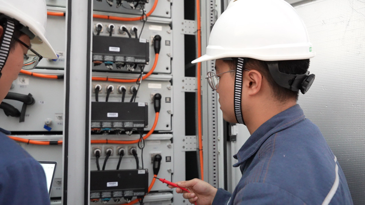 而在結(jié)構(gòu)連接方面,寶塘儲能站的連接方式多達(dá)5種,組串式、雙極式、單極式、低壓級聯(lián)、高壓級聯(lián)。其中,“高壓級聯(lián)”是南方電網(wǎng)首批“揭榜掛帥制”科研項(xiàng)目的攻關(guān)技術(shù),實(shí)體成果“我國首個(gè)高壓移動式儲能站”于2023年初在河北保定投運(yùn)。這種新技術(shù)通過模塊級聯(lián)的方式將儲能系統(tǒng)電壓直接升至10千伏,在大幅減少儲能系統(tǒng)數(shù)量的情況下實(shí)現(xiàn)同等效率,省去變壓器的儲能系統(tǒng)可靈活移動,解決了傳統(tǒng)儲能應(yīng)用場景受限的問題,迅速成為行業(yè)研發(fā)應(yīng)用的“熱門”。“安裝在寶塘儲能站的兩套高壓級聯(lián)儲能系統(tǒng),相對于河北保定系統(tǒng),硬件結(jié)構(gòu)及控制保護(hù)方面均實(shí)現(xiàn)了技術(shù)優(yōu)化,綜合性能更優(yōu)。”南網(wǎng)儲能高壓級聯(lián)攻關(guān)團(tuán)隊(duì)成員李勇琦指著新投運(yùn)的高壓級聯(lián)電池艙說道。