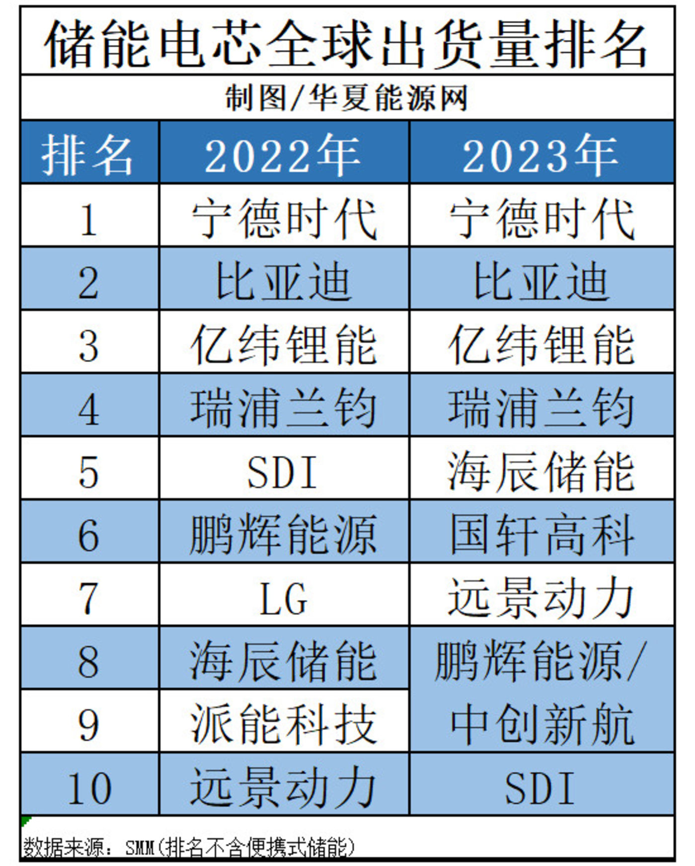 2023年的榜單與2022年相比,海辰儲(chǔ)能和遠(yuǎn)景動(dòng)力上升幅度較大。2022年海辰儲(chǔ)能位于第八名,2023年已躋身前五;遠(yuǎn)景動(dòng)力則從第十名上升到第七名。此外,中創(chuàng)新航首次進(jìn)入了十強(qiáng)。