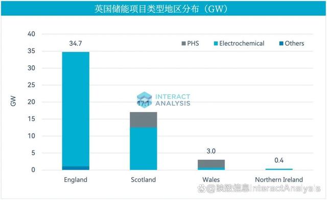 英國是全球重要的新型儲能市場,與德意等以戶儲為主的歐洲國家不同,大規(guī)模儲能在英國占據(jù)主導(dǎo)地位。據(jù)Interact Analysis全球儲能項目統(tǒng)計,截至2023年底,英國儲能項目總規(guī)模約55GW(含在規(guī)劃、在建及已投運的儲能項目),其中規(guī)劃及在建項目50GW。抽水蓄能項目總規(guī)模約6.7GW,新型儲能項目規(guī)模超48GW。