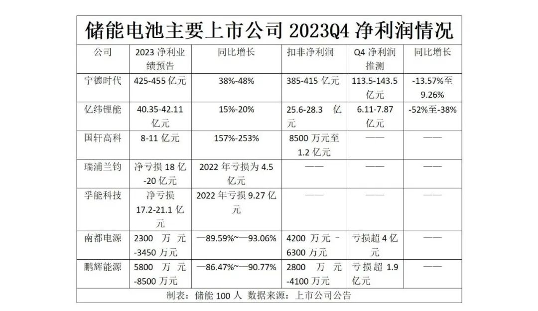 從鋰電儲(chǔ)能電池上市公司公布的業(yè)績(jī)預(yù)告來(lái)看,2023年四季度凈利潤(rùn)普遍增速放緩或下滑。寧德時(shí)代雖然日賺過(guò)億,但第四季度的凈利潤(rùn)有可能出現(xiàn)同比下滑的情況。