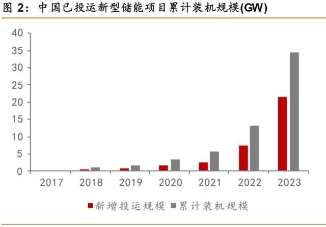 2023年中國新增投運新型儲能項目裝機(jī)規(guī)模21.5GW/46.6GWh,是2022年新增投運規(guī)模的3倍,預(yù)計2024年國內(nèi)全年新增裝機(jī)將超過35GW,保持高速增長。