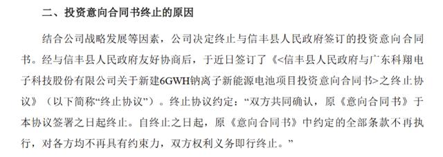 據(jù)科翔股份董秘辦的工作人員回應(yīng)稱(chēng),這是公司根據(jù)發(fā)展情況做出的決定,也表示公司還在繼續(xù)做鈉離子電池,后續(xù)應(yīng)該會(huì)披露進(jìn)展。信豐縣的終止項(xiàng)目是意向協(xié)議,而與大亞灣簽訂的是正式協(xié)議。