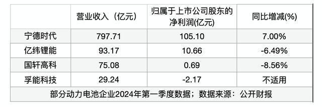 以2024年第一季度為例,頭部企業(yè)寧德時(shí)代營(yíng)收、凈利潤(rùn)超過(guò)百億元,中部企業(yè)差異顯著,尤其凈利潤(rùn)表現(xiàn)斷層,其中億緯鋰能超10億元凈利潤(rùn),而孚能科技則為凈虧損。
