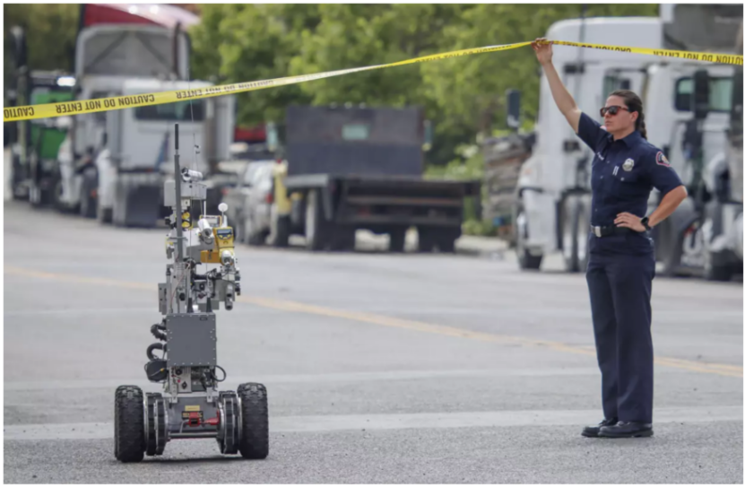 加州消防官員舉起警戒線,允許機(jī)器人進(jìn)入設(shè)施。(攝影:Sandy Huffaker,為《圣地亞哥聯(lián)合論壇報(bào)》提供)