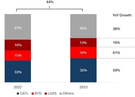 2023年全球電動(dòng)汽車(chē)電池裝機(jī)容量同比增長(zhǎng)44%,寧德時(shí)代和比亞迪作為中國(guó)電池制造商的代表,拿下了超過(guò)三分之二的市場(chǎng)份額,其中寧德時(shí)代是最大的受益者。