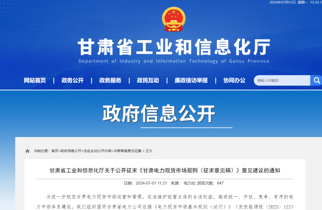 甘肅省工業(yè)和信息化廳關(guān)于公開征求《甘肅電力現(xiàn)貨市場規(guī)則(征求意見稿)》意見建議的通知