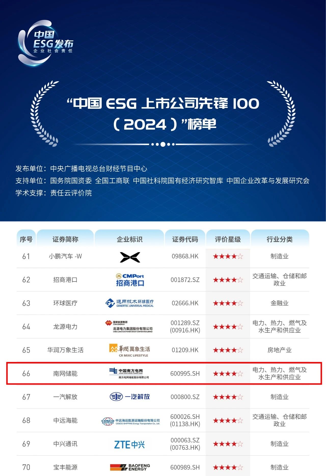 近日,中央廣播電視總臺(tái)財(cái)經(jīng)節(jié)目中心在北京正式發(fā)布《2024年度ESG行動(dòng)報(bào)告》,入圍《報(bào)告》的100家“中國ESG上市公司先鋒100”企業(yè)中,南方電網(wǎng)儲(chǔ)能股份有限公司(以下簡稱“南網(wǎng)儲(chǔ)能”)憑借在環(huán)境、社會(huì)和公司治理等方面的履責(zé)成效,從6471家中國上市公司樣本池、972家上市公司評(píng)價(jià)樣本中脫穎而出,蟬聯(lián)該榜單,位列第66位,較去年排名提升26位。