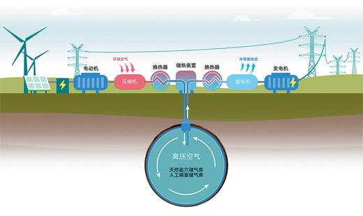 用電低谷時,富余的電能驅(qū)動壓縮機,將空氣壓縮成高壓狀態(tài)。壓縮機,類似自行車打氣筒,可將空氣打進“輪胎”里,這個“輪胎”就是鹽穴、人工硐室等密封儲氣庫。壓縮空氣過程中產(chǎn)生的熱量,則以熱水、熔鹽等形態(tài)儲存在地面的儲熱罐中。