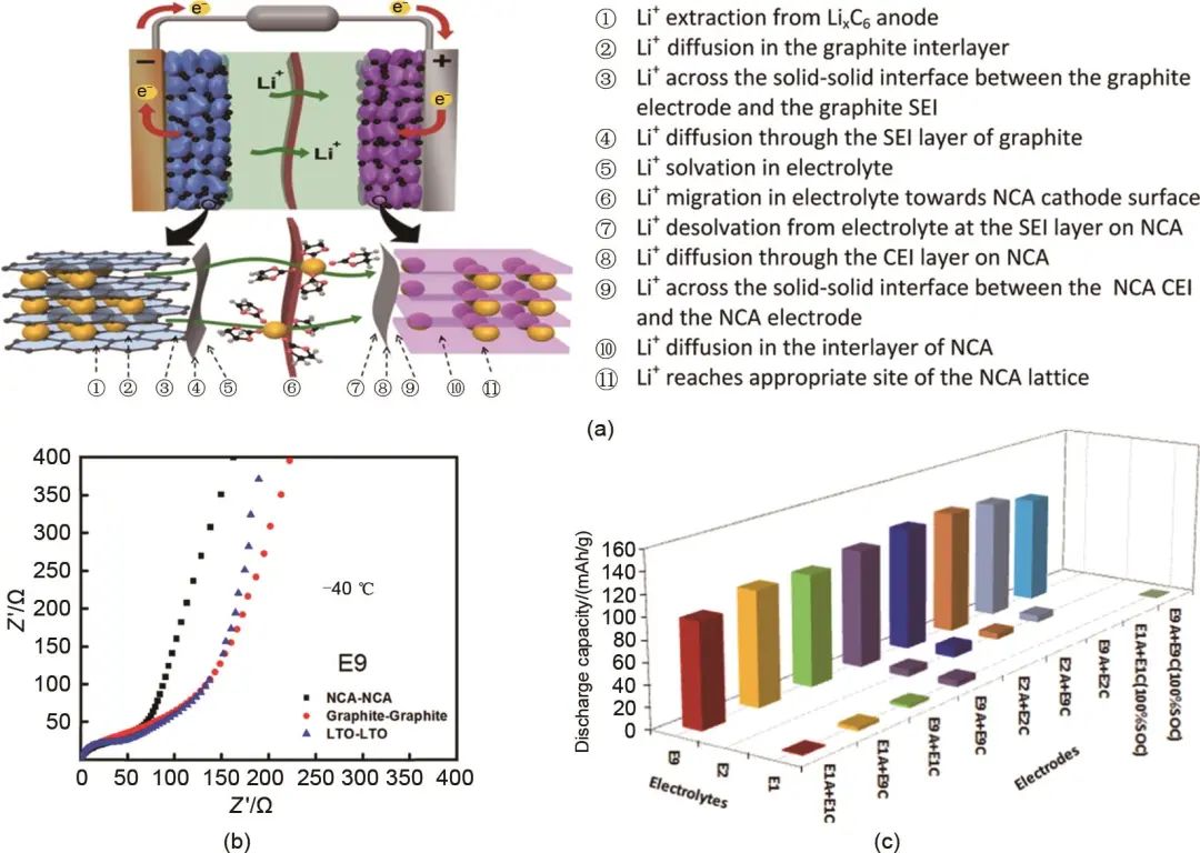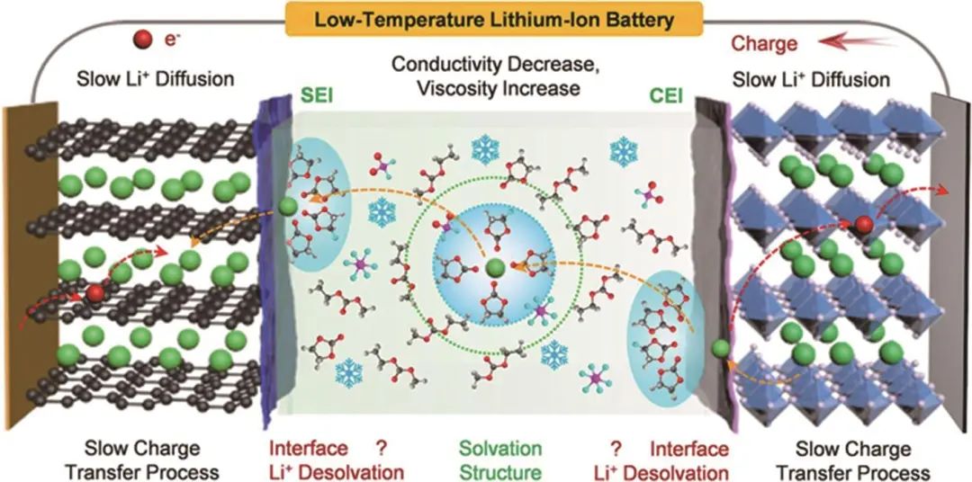 鋰電池低溫性能衰退的原因機理如圖2所示,主要是:①低溫下電解液的電導率下降,黏度上升,阻礙了Li+在電解液內(nèi)的遷移;②Li+在負極(例如石墨、硅、鋰金屬)或正極(例如LiNixMnyCo1-x-yO2)中的擴散系數(shù)在低溫下下降,導致從電極擴散到電解液內(nèi)的Li+減少;③低溫下電荷轉(zhuǎn)移過程更加困難,電荷轉(zhuǎn)移電阻(Rct)顯著提高,并且Li+在SEI和CEI內(nèi)的擴散系數(shù)下降。這三個原因分別從主體電解液中遷移、電極內(nèi)部擴散以及界面電荷轉(zhuǎn)移三個方面阻礙了鋰電池的正常運行,造成了電池極化效應的增大,從而降低了電池的放電容量和循環(huán)性能。