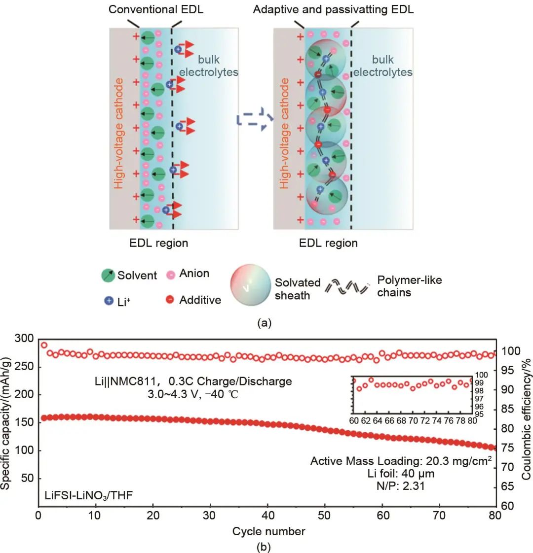 電池中的電極反應都是在電極-電解質(zhì)界面發(fā)生的,調(diào)控鋰離子在電極-電解質(zhì)界面處的溶劑化結(jié)構(gòu)和電荷轉(zhuǎn)移行為,加快鋰離子在界面處的離子傳輸和去溶劑化過程,有助于電池實現(xiàn)在低溫下高效穩(wěn)定運行。Zhang等提出了一種加入“刺激響應型”添加劑的在正極/電解液界面構(gòu)建了動態(tài)高穩(wěn)定雙電層的界面溶劑化結(jié)構(gòu)調(diào)控策略。作者篩選了一系列離子尺寸小且與鋰離子具有強結(jié)合能力的陰離子作為“刺激響應型”添加劑(例如NO3-、ClO4-、Br-等),如圖11(a)所示,添加劑陰離子在電池充電時,可在電壓驅(qū)動下快速遷移到正極界面,添加劑陰離子與鋰離子間的強相互作用使得在正極界面雙電層中形成了特殊的“超分子動態(tài)網(wǎng)絡(luò)結(jié)構(gòu)”。在此動態(tài)網(wǎng)絡(luò)結(jié)構(gòu)中,添加劑吸引豐富的鋰離子,促進鋰離子在界面處的遷移和從主體電解液中脫去溶劑,并且雙電層處于“富鋰離子-貧電解液”狀態(tài),其內(nèi)部所有的溶劑分子都參與鋰離子溶劑化,降低了雙電層內(nèi)溶劑的HOMO能級,將不穩(wěn)定的“自由溶劑”排除出雙電層,顯著提升了正極界面上溶劑的氧化穩(wěn)定性。通過這樣巧妙的電極/電解液界面設(shè)計實現(xiàn)了本體醚基電解液和界面電解液的解耦,憑借本體電解液的高離子導電性和界面處快速的電荷轉(zhuǎn)移機制實現(xiàn)了優(yōu)異的低溫性能。相較于常規(guī)電解液在0 ℃以下迅速下降的低溫性能,添加劑輔助的醚類電解液實現(xiàn)了Li/NMC全電池在-40 ℃下的穩(wěn)定充放電循環(huán)[圖11(b)]。這種利用特殊界面化學來優(yōu)化電解液低溫性能的方式在后期被廣泛關(guān)注,研究人員進一步豐富了具有界面調(diào)控功能的添加劑類型并對吸附性添加劑在界面的作用機理進行了補充探究。
