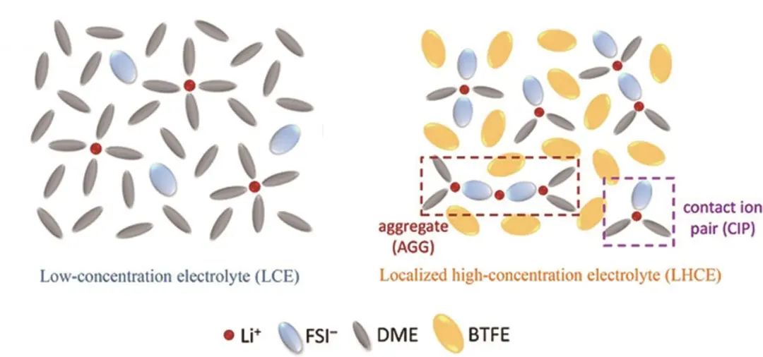 近些年來,高濃度電解液(HCEs)受到了廣泛的關(guān)注,通過提高電解液中的鋰鹽濃度,使得大量的鋰離子將全部溶劑完全配位,顯著提高溶劑的HOMO能級,提高電解液的電化學穩(wěn)定性。更重要的是當溶劑分子和鋰離子的摩爾比大于4時,溶劑分子不足以和大量的鋰離子完全配位,因此陰離子會“擠”進溶劑化鞘中,形成接觸離子對的CIP結(jié)構(gòu)和聚集離子對的AGG結(jié)構(gòu),這一存在陰離子的溶劑化結(jié)構(gòu)相較于原有的SSIP結(jié)構(gòu)擁有更低的去溶劑化能壘,并且參與溶劑化的陰離子表現(xiàn)出更低的LUMO能級,在形成SEI/CEI過程中,溶劑化結(jié)構(gòu)中的陰離子會優(yōu)先還原分解,形成含有更多陰離子衍生的無機組分的SEI,其擁有更好的電化學性能和機械穩(wěn)定性、更有利的鋰金屬兼容性,顯著提高鋰金屬負極的循環(huán)穩(wěn)定性。但是HCEs的黏度高、潤濕性差、電導率低等問題使得其在低溫下幾乎不能使用,并且由于超高的鋰鹽黏度,電池的能量密度顯著下降,成本也不可接受,這些都限制了HCEs的實際運用。為了解決HCEs的種種問題,研究人員提出使用非極性的低黏度稀釋劑來稀釋HCEs,非極性稀釋劑與鋰離子沒有相互作用,有效保留HCEs中特殊的CIP和AGG溶劑化結(jié)構(gòu)的同時,可降低鋰鹽濃度和電解質(zhì)的黏度,提高了整體電解液的電導率。如圖8所示,這種采用稀釋高濃電解液的方式得到的電解液被稱為局部高濃電解液(LHCEs),其保留了HCEs優(yōu)點的同時,極大地改進了HCEs的缺點,并且降低了成本,提高了整體的能量密度。