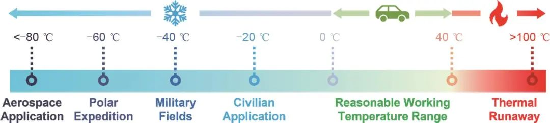 除了對能量密度的要求外,對鋰電池在特殊環(huán)境下的使用性能要求也越來越高。近年來,鋰電池在低溫環(huán)境下的性能受到了廣泛的關(guān)注。圖1展示了應用于不同領(lǐng)域的鋰電池所需的有效工作溫度范圍,在寒冷的季節(jié)或嚴寒地區(qū),消費電子或電動汽車上的民用鋰電池需要適應接近-20 ℃的低溫并要求進行穩(wěn)定的電池充放電,而使用在軍事或航空航天領(lǐng)域的電化學儲能系統(tǒng)的使用環(huán)境溫度甚至低于-60 ℃,但是目前普遍商業(yè)化使用的碳酸酯基電解液在-20 ℃時會發(fā)生電導率下降、黏度上升,甚至凝固等現(xiàn)象,引發(fā)電池嚴重的容量衰退、壽命減短和充電困難,這限制了現(xiàn)有鋰離子電池在低溫條件下的使用。因此如何抑制鋰電池在低溫下的容量衰退,提高其在低溫下的使用壽命和循環(huán)穩(wěn)定性,是鋰電池未來發(fā)展中的一個最重要的挑戰(zhàn)。
