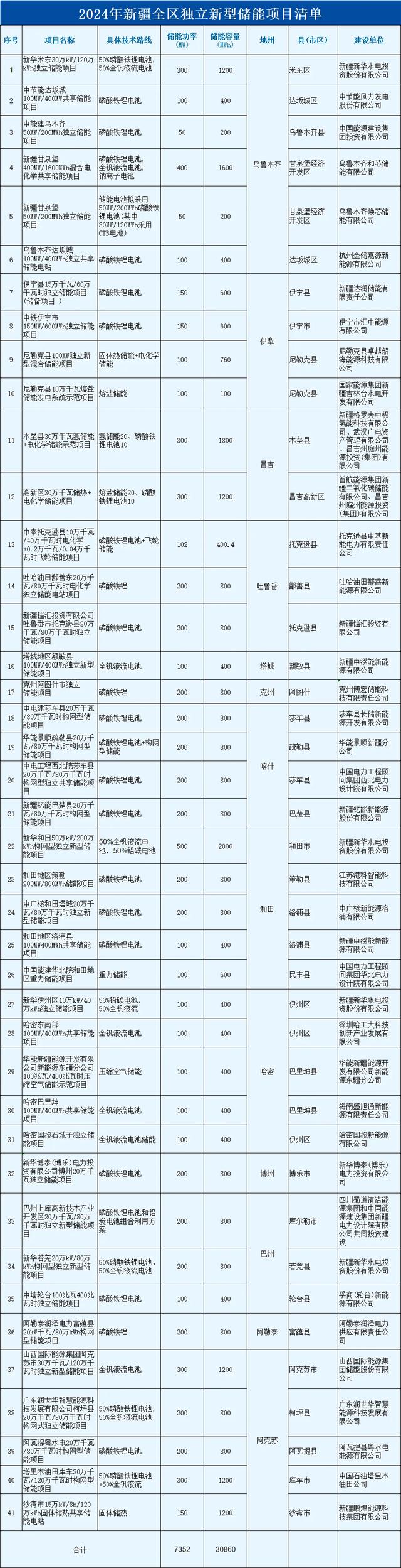 清單顯示,總共41個(gè)項(xiàng)目,總規(guī)模達(dá)7.35GW/30.86GWh。項(xiàng)目業(yè)主包括新華水電、中廣核、中石油、中能建、國(guó)家電投、華能等,其中,新華水電規(guī)模最大,5個(gè)項(xiàng)目,規(guī)模共1.3GW/5.2GWh。項(xiàng)目技術(shù)類型廣泛涵蓋磷酸鐵鋰、全釩液流、鈉離子電池、壓縮空氣、重力儲(chǔ)能、鉛炭、氫儲(chǔ)、熱儲(chǔ)等多種類型。其中,全釩液流電池項(xiàng)目12個(gè)(含混合儲(chǔ)能),規(guī)模超1.5GW/6GWh!
