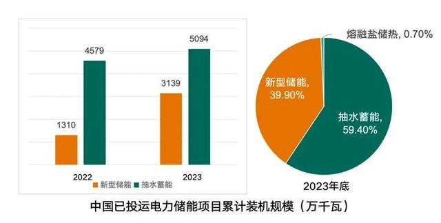 近兩年我國(guó)新型儲(chǔ)能(指除抽水蓄能以外,以輸出電力為主要形式的儲(chǔ)能技術(shù))發(fā)展迅速,新型儲(chǔ)能在我國(guó)電力儲(chǔ)能累計(jì)裝機(jī)中的占比由2022年的16%激增至2023年的40%。