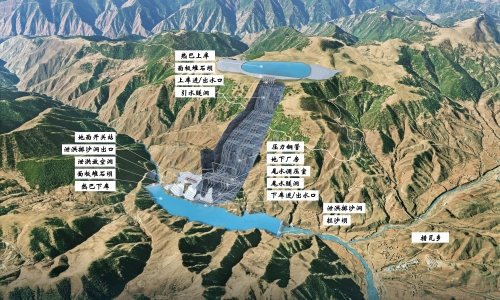 芒康熱巴抽水蓄能電站位于西藏自治區(qū)昌都市芒康縣,距昌都的直線距離約165千米。上水庫位于瀾滄江左岸二級支流達(dá)其曲右岸尼吉拉臺地上,通過開挖筑壩形成,流域面積1.06平方千米;下水庫位于達(dá)其曲干流上游河段,利用攔河壩和攔沙壩之間的天然地形成庫,下水庫攔沙壩控制流域面積328平方千米、攔沙壩~攔河壩區(qū)間流域面積4.75平方千米。電站連續(xù)滿發(fā)小時(shí)數(shù)6小時(shí),初擬額定水頭702米。樞紐工程主要由上水庫、下水庫、地下輸水發(fā)電系統(tǒng)、地面開關(guān)站和補(bǔ)水系統(tǒng)等建筑物組成。上水庫采用瀝青混凝土面板堆石壩,最大壩高66米,采用全庫盆瀝青混凝土面板防滲方案;下水庫攔河壩采用鋼筋混凝土面板堆石壩,最大壩高105米;下水庫攔沙壩采用碾壓混凝土重力壩,最大壩高60.5米;輸水線路水平距離約2940米,距高比4.24。從日曲左岸取水,永久補(bǔ)水線路采用地下埋管的布置方式,補(bǔ)水線路長約2.12千米。