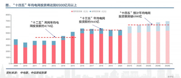 南方電網(wǎng)在“十四五”期間的計(jì)劃是總投約6700億元,較“十三五”總投資增長(zhǎng)約22%。兩者合計(jì)總投資就高達(dá)2.9萬(wàn)億元,如果算上地區(qū)電網(wǎng)公司,“十四五”期間全國(guó)電網(wǎng)總投資預(yù)計(jì)達(dá)到3萬(wàn)億元。
