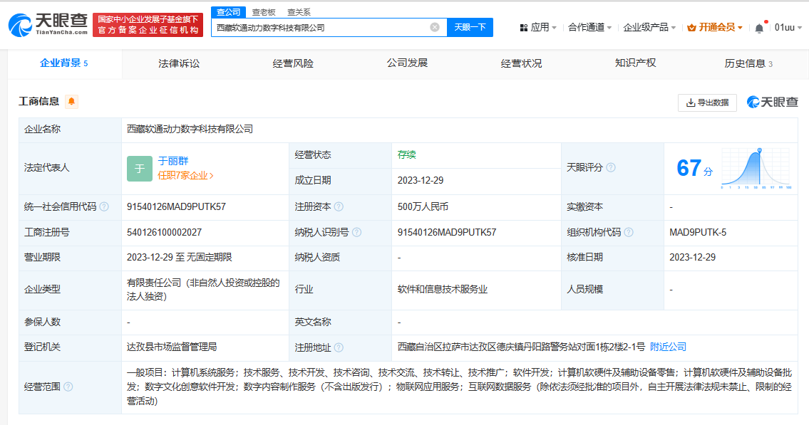 近日,西藏軟通動(dòng)力數(shù)字科技有限公司成立,法定代表人為于麗群,注冊(cè)資本500萬人民幣,經(jīng)營(yíng)范圍包括數(shù)字文化創(chuàng)意軟件開發(fā)、數(shù)字內(nèi)容制作服務(wù)、物聯(lián)網(wǎng)應(yīng)用服務(wù)、互聯(lián)網(wǎng)數(shù)據(jù)服務(wù)等。股東信息顯示,該公司由軟通動(dòng)力(301236)全資持股。