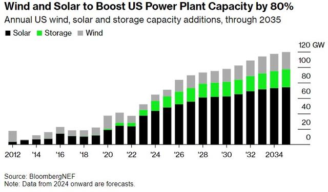 根據(jù)BloombergNEF預(yù)測(cè)數(shù)據(jù),預(yù)計(jì)到2035年,美國總發(fā)電量將增加80%,主要得益于近1太瓦的新增太陽能和風(fēng)能。