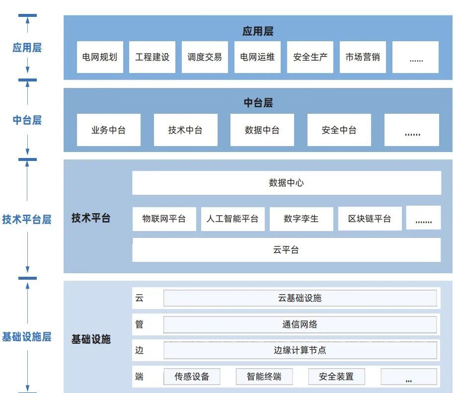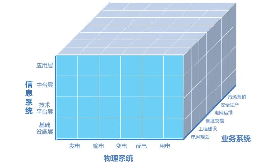 數(shù)字電網(wǎng)技術體系按照數(shù)字電網(wǎng)理論模型,由物理系統(tǒng)、信息系統(tǒng)、業(yè)務系統(tǒng)構成。如下圖的三維立體結構描述了數(shù)字電網(wǎng)技術體系架構,物理系統(tǒng)以發(fā)、輸、變、配、用為主線,業(yè)務系統(tǒng)分為電網(wǎng)規(guī)劃、工程建設、調(diào)度交易、電網(wǎng)運維、安全生產(chǎn)、市場營銷、人財物管理、黨政工團等方面;信息系統(tǒng)包 括基礎設施層、技術平臺層、中臺層、應用層。