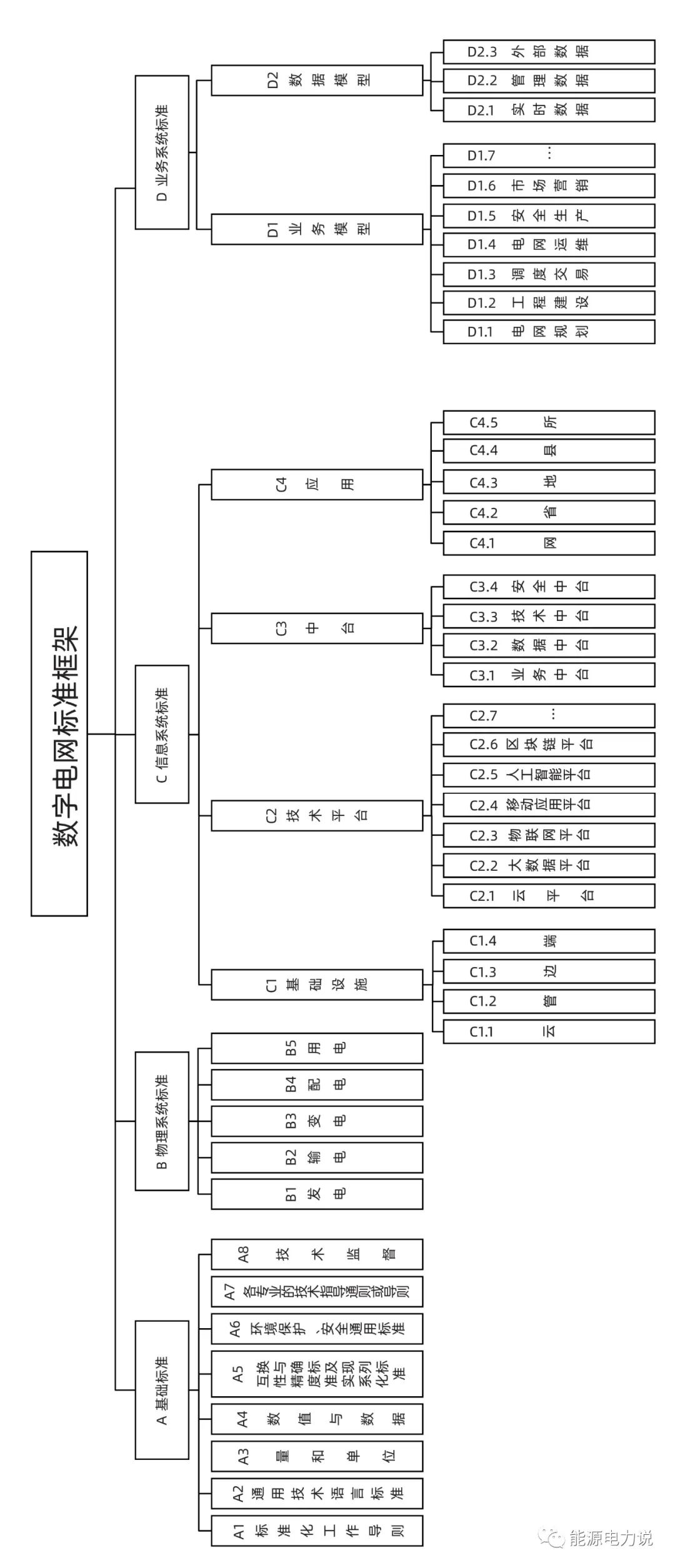 基礎標準:包括了標準化工作導則、通用技術語言標準等基礎通用標準。物理系統(tǒng)標準:包括了發(fā)電、輸電、變電、配電、用電五部分。信息系統(tǒng)標準 :包括了業(yè)務中臺、數(shù)據(jù)中臺、技術中臺、安全中臺等中臺的標準。業(yè)務系統(tǒng)標準:包括了業(yè)務模型與數(shù)據(jù)模型。