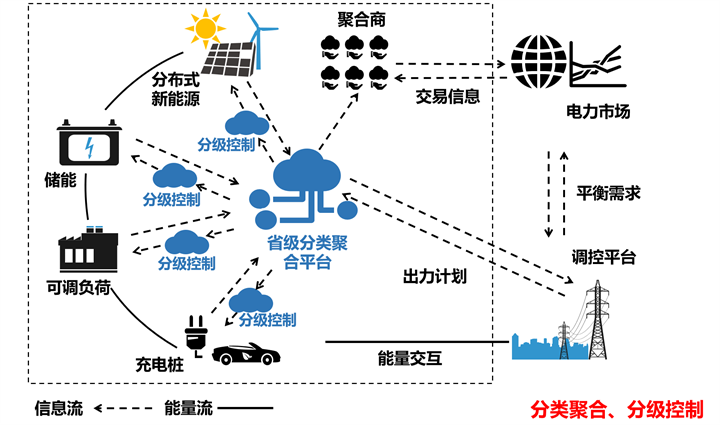 (十五)推動(dòng)源網(wǎng)荷儲(chǔ)電力資源分類(lèi)分級(jí)聚合。基于統(tǒng)一的數(shù)字底座、物聯(lián)采集與實(shí)時(shí)量測(cè)中心等技術(shù)架構(gòu),建立和完善省級(jí)源網(wǎng)荷儲(chǔ)分類(lèi)聚合平臺(tái),通過(guò)統(tǒng)一平臺(tái)對(duì)源網(wǎng)荷儲(chǔ)四側(cè)資源分散聚合控制,實(shí)現(xiàn)電力系統(tǒng)分層分級(jí)的綜合動(dòng)態(tài)平衡。開(kāi)展源網(wǎng)荷儲(chǔ)分類(lèi)分級(jí)聚合頂層設(shè)計(jì),研究制定分類(lèi)分級(jí)聚合的技術(shù)路徑和實(shí)施方案。推動(dòng)分布式光伏運(yùn)營(yíng)監(jiān)測(cè)平臺(tái)、配電監(jiān)控系統(tǒng)的升級(jí)改造和分級(jí)應(yīng)用,實(shí)現(xiàn)對(duì)分布式光伏的“剛性控”“柔性控”“群調(diào)群控”等多場(chǎng)景靈活控制。完善常規(guī)中小電源聚合平臺(tái),調(diào)動(dòng)中小電源深度聚合的積極性,提升中小電源統(tǒng)一調(diào)度能力,實(shí)現(xiàn)廣域協(xié)同、靈活互動(dòng)。深化建設(shè)新型負(fù)荷管理平臺(tái),提升新型負(fù)荷管理系統(tǒng)智能化、實(shí)用化水平,對(duì)負(fù)荷資源分層分類(lèi)統(tǒng)一管理、統(tǒng)一調(diào)控、統(tǒng)一服務(wù)。建設(shè)用戶(hù)側(cè)儲(chǔ)能監(jiān)控平臺(tái),分級(jí)分類(lèi)接入用戶(hù)側(cè)儲(chǔ)能電站數(shù)據(jù),實(shí)現(xiàn)海量用戶(hù)側(cè)儲(chǔ)能資源更大范圍的共享互濟(jì)和優(yōu)化配置。建立適應(yīng)源網(wǎng)荷儲(chǔ)分類(lèi)分級(jí)聚合的調(diào)度模式和交易機(jī)制,貫穿省、市、縣三級(jí)調(diào)度系統(tǒng),制定并網(wǎng)管理、運(yùn)行控制相關(guān)標(biāo)準(zhǔn)規(guī)范,完善清潔能源、需求側(cè)資源和儲(chǔ)能參與電力市場(chǎng)的機(jī)制,依托統(tǒng)一的信息共享和技術(shù)支持平臺(tái),培育多類(lèi)型聚合商參與分層分級(jí)聚合調(diào)度。構(gòu)建基于電網(wǎng)一張圖的新型電力系統(tǒng)全要素?cái)?shù)字底座,開(kāi)展新型電力系統(tǒng)各要素承載力的可視化推演計(jì)算,實(shí)現(xiàn)配網(wǎng)各環(huán)節(jié)、各業(yè)務(wù)以及新要素的全面圖上管控,提升分布式資源消納能力。