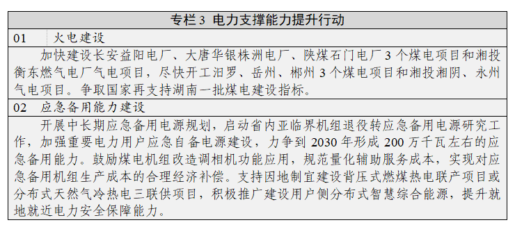 (八)提升電力應(yīng)急備用能力。加強(qiáng)極端形勢(shì)下電力風(fēng)險(xiǎn)管控,做好應(yīng)對(duì)自然災(zāi)害、尖峰負(fù)荷、大面積停電、電網(wǎng)攻擊等情況的保供預(yù)案,提高應(yīng)急處置和抗災(zāi)能力。開(kāi)展中長(zhǎng)期應(yīng)急備用電源規(guī)劃,按照最大負(fù)荷3%—4%疊加新能源裝機(jī)容量1%—3%標(biāo)準(zhǔn)配置應(yīng)急備用電源規(guī)模。落實(shí)國(guó)家應(yīng)急備用電源管理要求,科學(xué)認(rèn)定和退出應(yīng)急備用機(jī)組,對(duì)符合能效、環(huán)保、安全等政策和標(biāo)準(zhǔn)要求的退役火電機(jī)組,按照“關(guān)而不拆”原則轉(zhuǎn)為應(yīng)急備用電源,做好設(shè)備維護(hù)和燃料供應(yīng)保障。支持分布式天然氣發(fā)電項(xiàng)目建設(shè),在有規(guī)模熱(冷)負(fù)荷的工業(yè)園區(qū)、經(jīng)濟(jì)開(kāi)發(fā)區(qū)、空港新區(qū)等區(qū)域,因地制宜建設(shè)背壓式燃煤熱電聯(lián)產(chǎn)項(xiàng)目或分布式天然氣冷熱電三聯(lián)供項(xiàng)目,積極推廣建設(shè)用戶(hù)側(cè)分布式智慧綜合能源,提升就地就近電力安全保障能力。加強(qiáng)政府、醫(yī)院、鐵路、民航等重要電力用戶(hù)應(yīng)急自備電源建設(shè),力爭(zhēng)實(shí)現(xiàn)應(yīng)配盡配全面覆蓋,電源容量應(yīng)滿(mǎn)足全部保安負(fù)荷需求。加強(qiáng)抽水蓄能電站應(yīng)急備用能力建設(shè),推動(dòng)抽水蓄能電站具備黑啟動(dòng)功能。做好一次能源監(jiān)測(cè)預(yù)警和供應(yīng)協(xié)調(diào),提升電源發(fā)電能力,利用負(fù)荷和電源的時(shí)空互補(bǔ)特性,有效提高湖南與其他區(qū)域間電力互補(bǔ)互濟(jì)、調(diào)劑余缺能力。