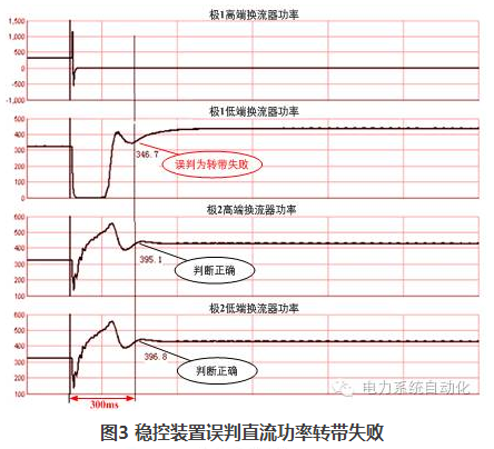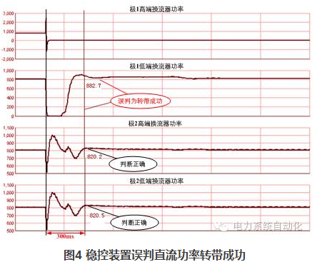 直流故障前后總損失的功率是穩(wěn)控系統(tǒng)執(zhí)行控制策略的重要依據(jù)。直流故障暫態(tài)過程復(fù)雜,若由穩(wěn)控裝置計算事故前功率與事故后的穩(wěn)態(tài)功率差,事故前后的時間窗口Δt難以確定。實踐表明:Δt過短(最初設(shè)計為30ms),可能會誤判健全換流器的轉(zhuǎn)帶;而延長Δt,即便是增加至300ms,在某些運行工況下,仍然會出現(xiàn)誤判為轉(zhuǎn)帶失?。ㄈ鐖D3)或誤判為轉(zhuǎn)帶成功(如圖4)的情況。經(jīng)過大量實驗數(shù)據(jù)分析,若要確保在所有故障工況下裝置均不會誤判,則Δt至少需延長至500ms以上,無法滿足電網(wǎng)的穩(wěn)定控制需求。