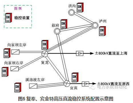 隨著多個特高壓交直流輸電通道的建成投產(chǎn),控制策略的設(shè)計和制定面臨新的要求,尤其體現(xiàn)在多個穩(wěn)控系統(tǒng)和控制策略間的協(xié)調(diào)控制方面。以復(fù)奉直流、賓金直流為例,為了解決兩大特高壓直流送出的穩(wěn)定問題,在復(fù)龍換流站、宜賓換流站、溪洛渡電廠等8個廠站配置了安全穩(wěn)定控制裝置,如圖5所示。經(jīng)計算,兩大直流故障后均可能會切除向左、向右以及溪左三個電廠的機組,兩個穩(wěn)控系統(tǒng)之間的控制措施有重疊。若按傳統(tǒng)的思路制定策略和實施方案,兩套穩(wěn)控系統(tǒng)間無信息交互和協(xié)調(diào),當出現(xiàn)兩大直流同時雙極閉鎖的極端故障時,某些機組會同時被兩個主站發(fā)來的命令切除,從而導(dǎo)致控制措施量不足。