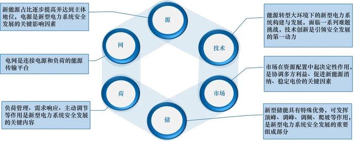 新型電力系統(tǒng)是實(shí)現(xiàn)“雙碳”目標(biāo)、重塑能源安全格局的重要載體,構(gòu)建新型電力系統(tǒng)是提高能源安全韌性的根本性舉措。新型電力系統(tǒng)的安全發(fā)展主要受到源、網(wǎng)、荷、儲(chǔ)、市場、技術(shù)六大因素的綜合影響(見圖1)。