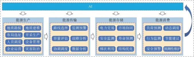 能源全產(chǎn)業(yè)鏈與AI的互相影響逐漸加深,如圖1所示。在能源生產(chǎn)環(huán)節(jié),AI技術(shù)應(yīng)用于不可再生能源(煤、石油、天然氣等)地質(zhì)勘探、地質(zhì)建模過程,極大提高勘探的效率與準(zhǔn)確性。在開采過程中,AI驅(qū)動的智能作業(yè)系統(tǒng)(設(shè)備)能夠根據(jù)實(shí)時(shí)地質(zhì)條件自動調(diào)整作業(yè)參數(shù),提高作業(yè)效率和安全性。從礦床開采全生產(chǎn)周期來看,基于AI分析的生產(chǎn)優(yōu)化模型可以通過協(xié)調(diào)調(diào)度和運(yùn)營優(yōu)化,合理調(diào)配開采作業(yè)強(qiáng)度,優(yōu)化生產(chǎn)周期。在可再生能源生產(chǎn)方面,利用AI技術(shù)優(yōu)化選址、設(shè)備運(yùn)行參數(shù)以及與其他能源形式的協(xié)同調(diào)度,在一定程度上可克服太陽能、風(fēng)能等間歇性能源的不確定性,提升可再生能源在電網(wǎng)中的接入比例和穩(wěn)定性,促進(jìn)能源結(jié)構(gòu)的優(yōu)化。