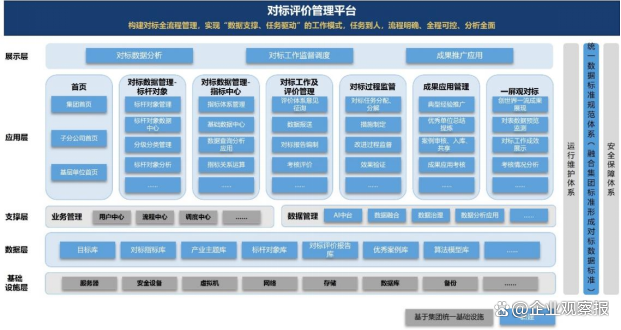 對(duì)標(biāo)平臺(tái)總體按照頂層規(guī)劃、集中部署、分層分級(jí)應(yīng)用、場(chǎng)景引導(dǎo)、上下協(xié)同、全面提升的建設(shè)原則開(kāi)展集團(tuán)對(duì)標(biāo)評(píng)價(jià)管理平臺(tái)的規(guī)劃建設(shè)。依托集團(tuán)已有數(shù)據(jù)湖、數(shù)據(jù)中臺(tái)及技經(jīng)院的指標(biāo)體系設(shè)計(jì)成果,按照集團(tuán)數(shù)據(jù)治理平臺(tái)管控要求,實(shí)現(xiàn)集團(tuán)全層級(jí)對(duì)標(biāo)體系的規(guī)范化管理。在此基礎(chǔ)上,構(gòu)建面向各級(jí)不同對(duì)標(biāo)對(duì)象的對(duì)標(biāo)數(shù)據(jù)庫(kù),推進(jìn)集團(tuán)數(shù)據(jù)資源循環(huán)暢通、釋放數(shù)據(jù)要素資源價(jià)值。平臺(tái)縱向上,向下完成基層延伸,推進(jìn)子公司和基層單位對(duì)標(biāo)平臺(tái)融合接入集團(tuán)全層級(jí)對(duì)標(biāo)評(píng)價(jià)管理平臺(tái),打通各級(jí)子公司和基層單位系統(tǒng)間的“信息孤島”,構(gòu)建全集團(tuán)對(duì)標(biāo)評(píng)價(jià)的信息化生態(tài)圈;系統(tǒng)橫向上,實(shí)現(xiàn)與集團(tuán)智能設(shè)備、智能控制、智能生產(chǎn)執(zhí)行、管理支持、業(yè)務(wù)運(yùn)營(yíng)、戰(zhàn)略管控和決策等各領(lǐng)域業(yè)務(wù)系統(tǒng)的互聯(lián)互通,形成縱向貫通、橫向協(xié)同、覆蓋全集團(tuán)的“一體化對(duì)標(biāo)評(píng)價(jià)”體系。