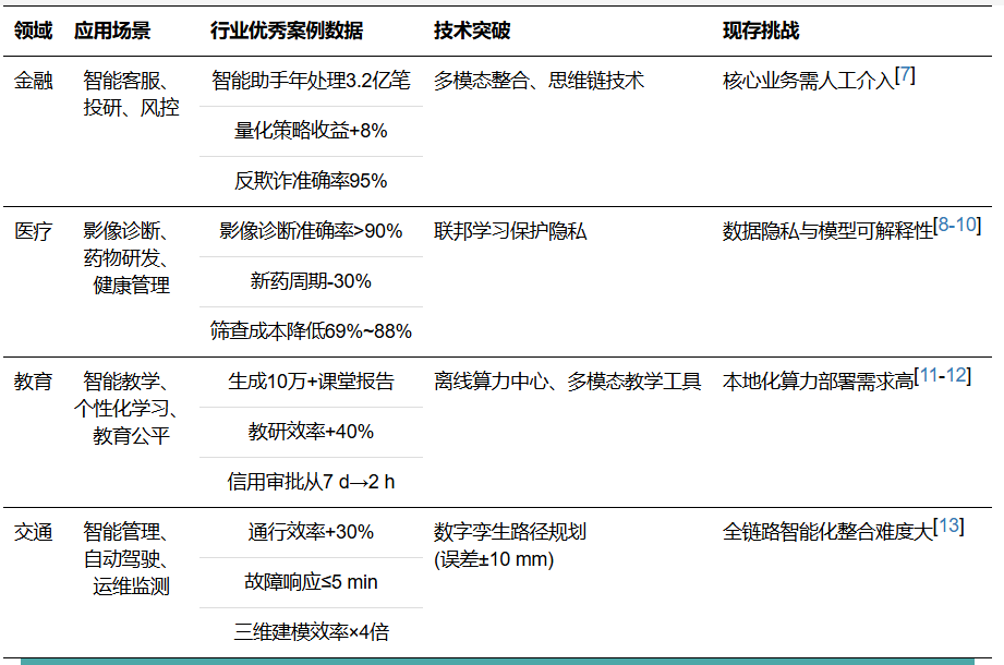 當前,AI大模型已在金融、醫(yī)療、教育、交通等領(lǐng)域?qū)崿F(xiàn)深度滲透,展現(xiàn)出顯著的產(chǎn)業(yè)價值與技術(shù)潛力。如表1所示,在金融領(lǐng)域,智能客服與風控系統(tǒng)的高效運作體現(xiàn)了多模態(tài)整合與思維鏈技術(shù)的成熟應用,但核心決策仍依賴人工。醫(yī)療領(lǐng)域通過聯(lián)邦學習等技術(shù)突破,在影像診斷、藥物研發(fā)等方面取得成果,但數(shù)據(jù)隱私與模型可解釋性仍是關(guān)鍵瓶頸。教育領(lǐng)域依托離線算力中心與多模態(tài)工具,實現(xiàn)教學效率躍升,而本地化算力需求成為規(guī)模化應用的制約因素。交通領(lǐng)域借助數(shù)字孿生技術(shù)顯著提升運維效率,但全鏈路智能化整合仍需突破。