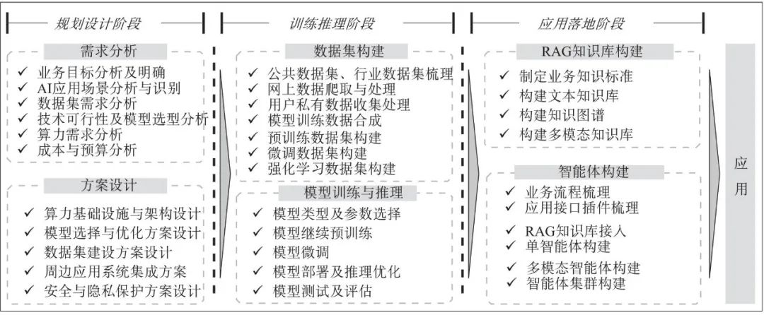 AI工程化整體流程涵蓋規(guī)劃設計、訓練推理和應用落地三個階段(如圖1所示)。在規(guī)劃設計階段,首要關(guān)注企業(yè)戰(zhàn)略和業(yè)務目標選擇,圍繞全鏈路規(guī)劃展開需求分析,包括業(yè)務目標分析、AI應用場景分析、數(shù)據(jù)需求分析、技術(shù)可行性及算力需求分析等。同時,基于AI原生(AI Native)的系統(tǒng)方案設計強調(diào)業(yè)務需求理解、數(shù)據(jù)治理、模型優(yōu)化與部署以及監(jiān)控與運維的重要性,遵循以AI為核心、數(shù)據(jù)優(yōu)先、持續(xù)學習與迭代、自適應與個性化等設計原則。在訓練推理階段,針對通用AI大模型存在的“有幻覺、成本高”等問題,行業(yè)、領(lǐng)域AI大模型成為落地“人工智能+”的有效手段,企業(yè)需根據(jù)自身情況選擇開發(fā)L1行業(yè)模型或L2場景模型,并依托成熟工具平臺支撐數(shù)據(jù)集工程交付能力,同時注重模型體系設計與選擇、訓練及調(diào)優(yōu)以及推理優(yōu)化及評估等關(guān)鍵環(huán)節(jié)。在應用落地階段,智能體應用為AI大模型應用落地提供技術(shù)化手段,通過構(gòu)建檢索增強生成(Retrieval-Augmented Generation,RAG)知識庫解決私域數(shù)據(jù)利用及實時性問題,同時智能體構(gòu)建的技術(shù)方法手段多樣,包括通過開發(fā)框架直接開發(fā)和基于智能體使能平臺構(gòu)建應用,且智能體全生命周期可觀測體系和集群全生命周期管理體系為企業(yè)AI應用的穩(wěn)定運行和持續(xù)優(yōu)化提供保障。