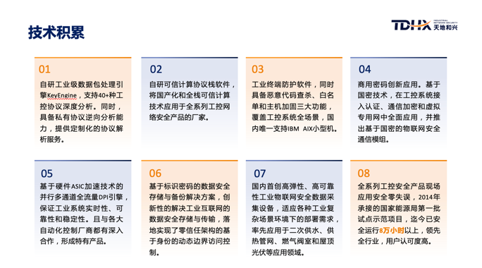 本次活動中,副總裁楊小帥更近一步向大家介紹了天地和興深厚的技術積累:自研工業(yè)級數(shù)據(jù)包處理引擎KeyEngine,支持40+種工控協(xié)議深度分析;自研可信計算協(xié)議棧軟件,是將國產化和全??尚庞嬎慵夹g應用于全系列工控網絡安全產品的廠商;工業(yè)終端防護軟件,覆蓋工控系統(tǒng)全場景,還是國內唯一支持IBM AIX小型機;商用密碼創(chuàng)新應用,并推出基于國密的物聯(lián)網安全通信模組;基于硬件ASIC加速技術的并行多通道全流量DPI引擎,保證工業(yè)系統(tǒng)實時性、可靠性和穩(wěn)定性;基于標識密碼的數(shù)據(jù)安全存儲與備份解決方案,創(chuàng)新性的解決工業(yè)互聯(lián)網的數(shù)據(jù)安全存儲與傳輸;國內首創(chuàng)高彈性、高可靠性工業(yè)物聯(lián)網安全數(shù)據(jù)采集設備,適應各種工業(yè)復雜場景環(huán)境下的部署需求;全系列工控安全產品現(xiàn)場應用安全零失誤,2014年承接的國家能源局第一批試點示范項目,迄今已安全運行8萬小時以上。