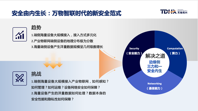 工業(yè)和信息化部研究機構數(shù)據(jù)顯示:我國工業(yè)互聯(lián)網產業(yè)規(guī)模目前已邁過了“萬億”大關,并進一步刺激了數(shù)字經濟在工業(yè)領域的廣泛應用,工業(yè)制造的數(shù)字化和網絡化催生出巨大的網絡安全需求。天地和興CTO李凱斌介紹:數(shù)字經濟大背景下,萬物智聯(lián)時代將面臨新安全挑戰(zhàn),即:1、端側海量設備大規(guī)模接入產業(yè)物聯(lián)網,如何感知?如何管理?如何運維?設備網絡安全如何保障?2、海量設備產生的洋量數(shù)據(jù)如何處理?數(shù)據(jù)本身的安全性能和隱私性如何保障?而解決之道在于“三力合一”:安全能力、算力、通信能力,三者合一。安全,由內生長。