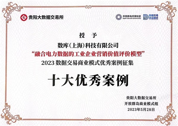 值得一提的是,在此次數(shù)博會期間舉辦的中國數(shù)據(jù)首席地推官40人論壇中,數(shù)庫科技與南方電網(wǎng)貴州電網(wǎng)公司產(chǎn)出的這一創(chuàng)新成果還被授予了“2023數(shù)據(jù)交易商業(yè)模式十大優(yōu)秀案例”的殊榮: