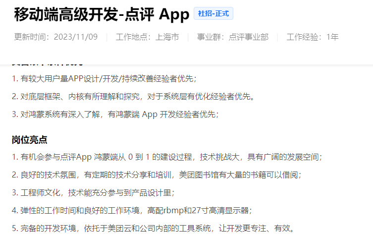 美團(tuán)發(fā)布了鴻蒙高級工程師、鴻蒙基建工程師等多個(gè)鴻蒙開發(fā)相關(guān)崗位。主要開發(fā)美團(tuán)鴻蒙App、大眾點(diǎn)評鴻蒙App。網(wǎng)易更新了高級/資深A(yù)ndroid 開發(fā)工程師崗位,職位要求參與云音樂多端多OS的產(chǎn)品(Android、鴻蒙等)研發(fā)迭代。